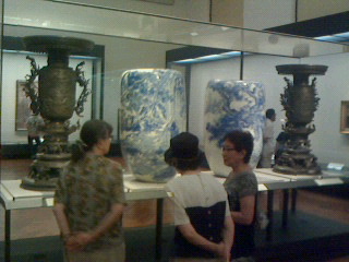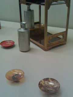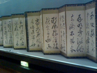 その他に工芸品ではウィーン万博展示品などもありました。他のコーナーではノンベイですから鼈甲の酒器が気になりました。手の込んだ作品です。夏らしい扇、漢字だらけで息苦しくなりそうな屏風です。