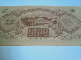 上記の7種類だそうです。私は現在4~7までの4種類、その他に数に入っていませんが大日本帝国政府発行の軍用手票100円があります。(小さい写真はお札の裏側、クリックすればおおきくなります。)