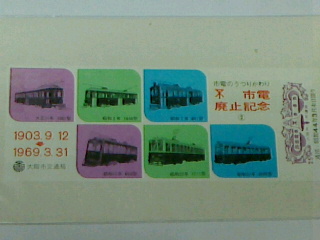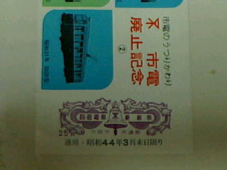 市電の移り変わり大正11年から昭和31年3000型まで。昭和44年3月発行。印紙みたいな変わった乗車券25円。