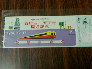 地下鉄2号線 谷町四―天王寺開通記念乗車券